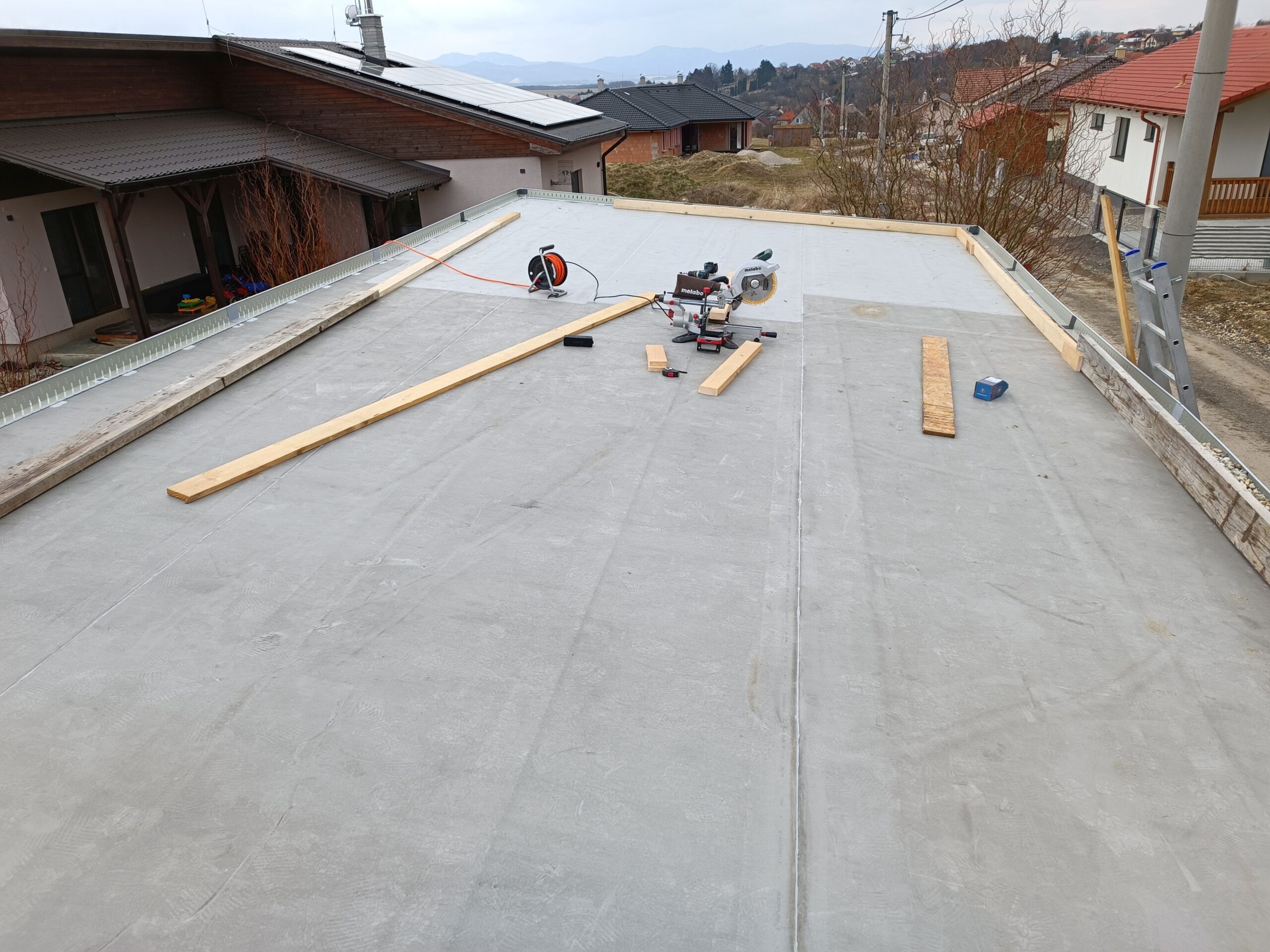 Konečne prišiel správny čas na substrát. Deň predtým, ako bol dohodnutý, bolo potrebné spraviť ďalšiu prípravu. Dôležité je bezveterné počasie. Medzi dosky som natiahol 300g/m2 geotextíliu, po okrajoch som ju zdvihol cca 9 cm k doskám. Bude oddelovať štrk od substrátu, keď vytiahnem dosky. priamo na geotextíliu idú vegetačné rohože….